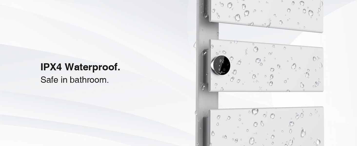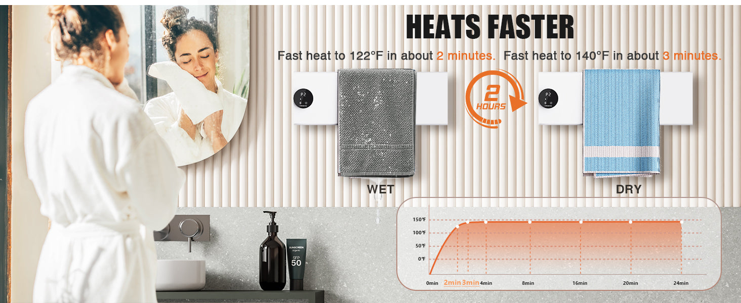 [Rapid Heating Technology]: Achieves your desired temperature in just 1-3 minutes! The towel rack heats to 122°F (approx. 2 minutes) and reaches 140°F in about 3 minutes. Designed for energy efficiency, it operates at 85W for 1 bar, 140W for 2 bars, 210W for 3 bars, and 280W for 4 bars. The anti-scald panel ensures safe operation even at high temperatures.